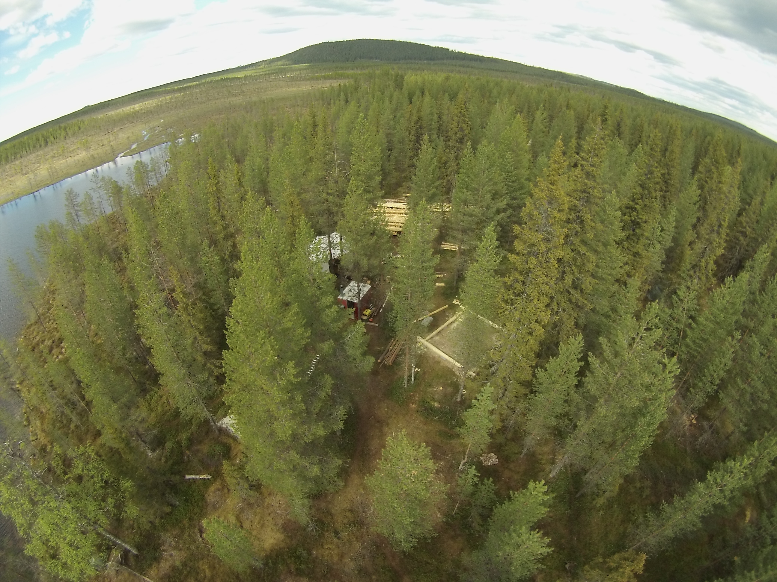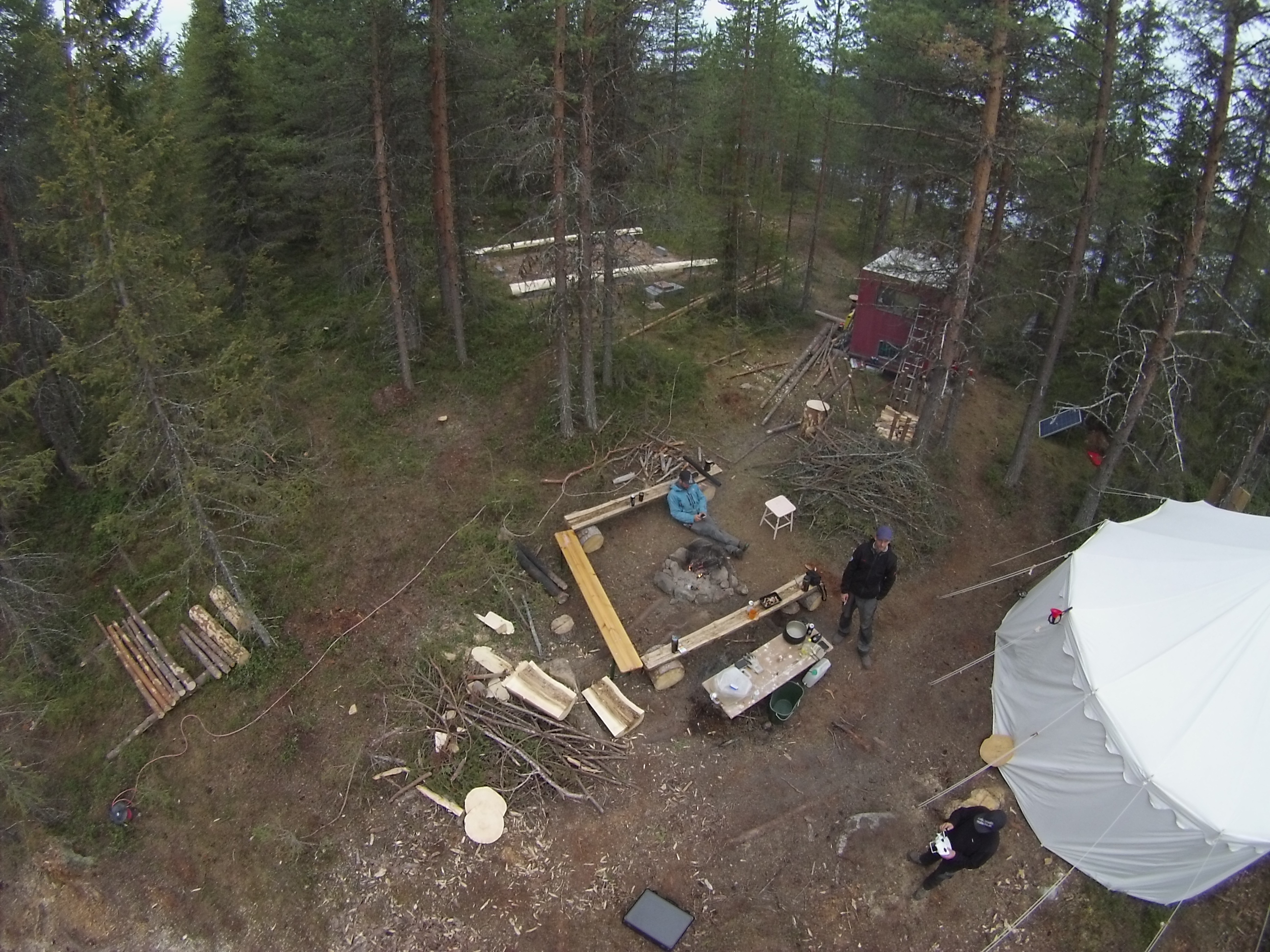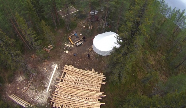 Moderne Blockhausbauer haben Drohnen, mit denen Sie den Bauplatz aus der Luft Fotografieren können.